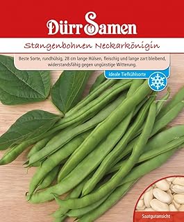 Stangenbohne Neckarkönigin Phaseolus vulgaris var. vulgaris Neckarköniginist eine bewährte, ertragreiche Sorte mit zarten, fleischigen, etwa 28 cm langen, geraden, dunkelgrünen Hülsen. Sie ist robust und resistent gegen das Bohnenmosaikvirus, daher bestens für den Freilandanbau geeignet. Stangenbohnen können in Töpfen vorgezogen werden, das verhindert den Befall mit Wurzelfliegen und ermöglicht eine frühere Ernte. Bei Direktsaat die Rankhilfen vor der Aussaat errichten. Die Ranken in 2 m Höhe abschneiden, dann verzweigt sich die Stangenbohne wieder und die Pflückhöhe bleibt im Rahmen. Rohe Bohnen sind giftig!